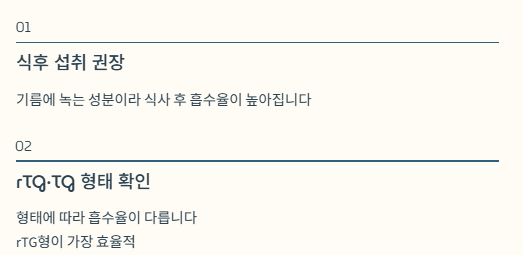 기름에 녹는 성분이기 때문에 식사 후 섭취해야 흡수율이 더 높아집니다.
