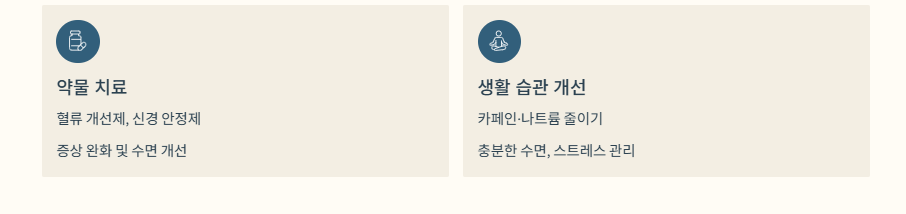 | 약물 치료 | 혈류 개선제, 신경 안정제, 수면 유도제 등을 사용하여 증상을 완화시키고 수면의 질을 개선합니다. |