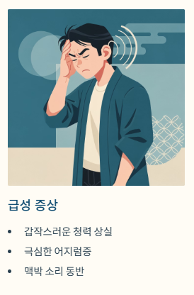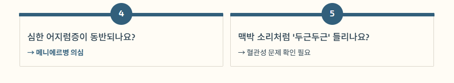| 4. 이명과 함께 **심한 어지럼증(빙글빙글 도는 느낌)**이 동반되나요? | 예 | 메니에르병 의심, 정밀 진단 필요 |