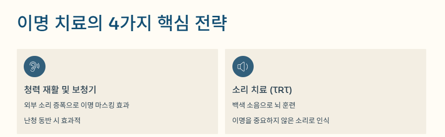 이명의 치료는 원인과 유형에 따라 다르지만, 만성 이명은 완치보다는 **'적응'과 '완화'**에 중점을 둡니다.
