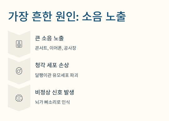 반복적이거나 급격한 큰 소음(콘서트, 이어폰 소리, 공사장 소음 등)에 노출되면 달팽이관 속 **청각 세포(유모세포)**가 손상됩니다. 손상된 세포는 제 기능을 하지 못하며 뇌로 비정상적인 신호를 보내는데, 뇌는 이를 삐소리로 인식합니다.