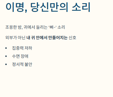 조용한 밤에 침대에 누웠을 때, 혹은 갑자기 스트레스를 심하게 받았을 때 귀에서 '삐~', '윙~', '쉭~' 하는 소리를 느껴본 적이 있으신가요? 이는 외부의 소리가 아닌 자신만이 듣는 소리, 즉 이명(耳鳴, Tinnitus) 현상입니다. 이명은 현대인들에게 매우 흔하게 나타나며, 단순한 불편함을 넘어 집중력 저하, 수면 장애, 심지어 우울증까지 유발할 수 있는 증상입니다.