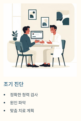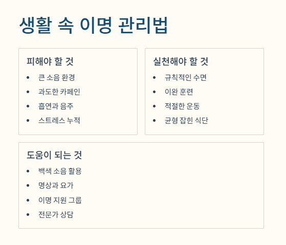 | 생활 습관 개선 | 카페인, 나트륨, 흡연, 음주를 줄여 귀 주변 혈액 순환을 개선하고, 충분한 수면과 스트레스 관리에 집중합니다. |