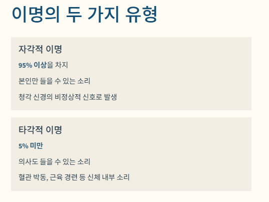 | 이명 유형 | 설명 및 발생 원리 | 발생 비율 |