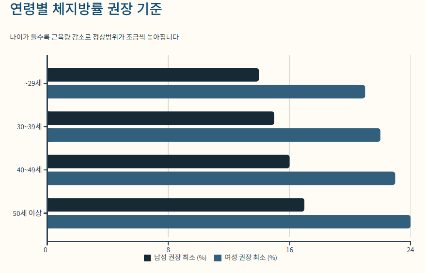 ✅ 연령별 체지방률 권장 기준 (WHO 기준 참고)