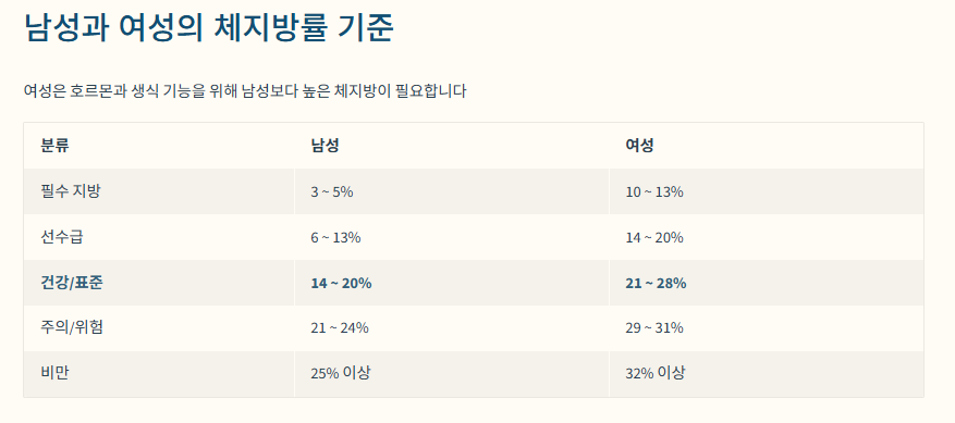 ✅ 성별 체지방률 정상범위 및 비만 기준
