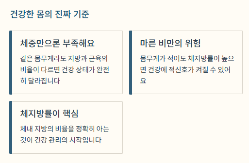 - 의미: 몸의 '구성 비율'을 알려주기 때문에 비만도를 진단하는 가장 중요한 기준이 됩니다.
