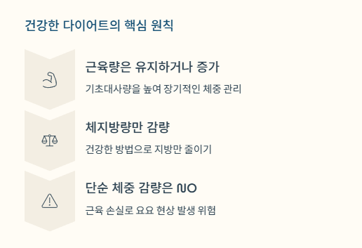 체지방량 목표 설정의 핵심: 근육량은 최대한 유지하거나 늘리고, 체지방량만 줄이는 것이 가장 건강한 다이어트입니다. 단순히 몸무게만 줄이면 근육 손실로 인해 건강 악화 및 요요 현상이 발생하기 쉽습니다.