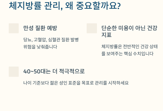 체지방률은 단순한 미용의 기준을 넘어 만성 질환(당뇨, 고혈압, 심혈관 질환) 발병 위험을 판단하는 중요한 건강 지표입니다.
