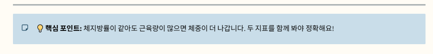 💡 중요성: 체지방률이 같더라도 근육량이 많으면 체중이 더 나가기 때문에, 체지방률과 근육량을 함께 고려해야 건강한 몸 상태를 정확히 파악할 수 있습니다.
