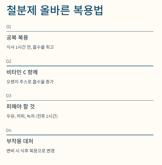 - 우유, 커피, 녹차는 철분 흡수를 방해하므로 복용 전후 2시간은 피해야 합니다.