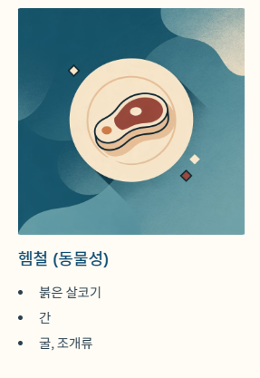 - 철분 (헴철): 붉은 살코기(소고기, 돼지고기), 간, 해산물(굴, 조개류).