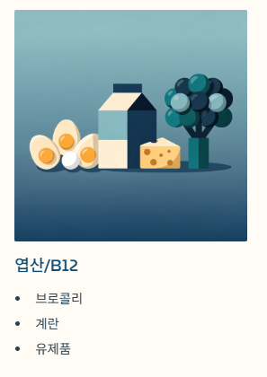 - 엽산/B12: 시금치, 브로콜리, 계란, 유제품.