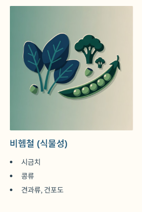 - 철분 (비헴철): 시금치, 콩, 견과류, 건포도.