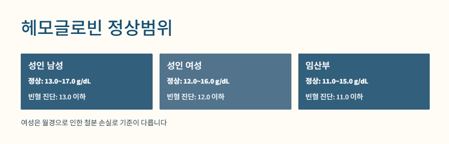 1. 빈혈 진단의 핵심: 헤모글로빈(Hb) 정상범위