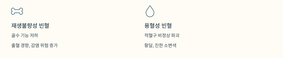 | 재생불량성 | 골수 기능 저하 (적혈구, 백혈구, 혈소판 모두 감소) | 출혈 경향, 감염에 취약함, 극심한 피로 |