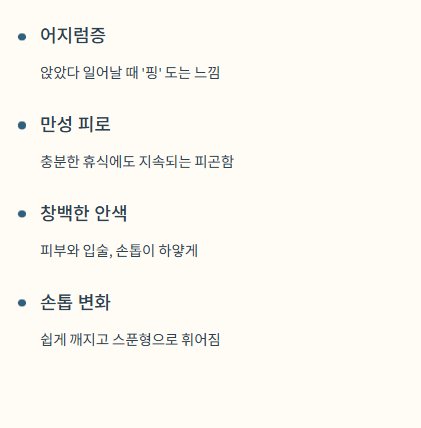 | 철분 결핍성 | 철분 섭취 부족, 월경 과다, 위장 출혈 등 | 어지럼증, 만성 피로, 창백한 안색, 손톱 깨짐(스푼형 손톱) |