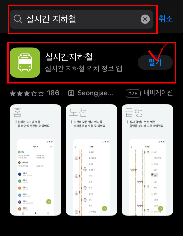 (1) 먼저 위의 링크를 통해 어플다운 또는 어플스토어에서 실시간지하철 검색 후 다운로드진행해 줍니다.