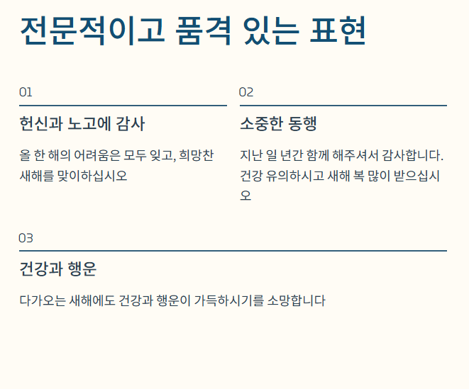 - "OOO님의 리더십 덕분에 많은 것을 배웠습니다. 새해에도 건승을 기원하며, 가정에 평안이 가득하시길 바랍니다."