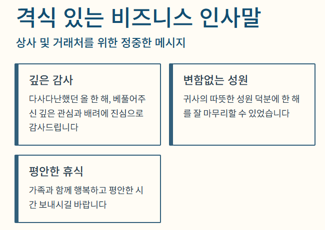 - "연말연시, 따뜻하고 풍요로운 시간 보내세요. OOO님의 하시는 모든 일에 만복이 깃들기를 기원합니다."