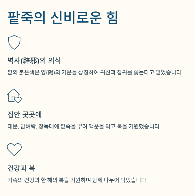 | 핵심 의식 | 팥죽을 쑤어 조상께 먼저 제사 지내고, 집 안팎에 뿌려 잡귀를 쫓은 후 먹었습니다. | |