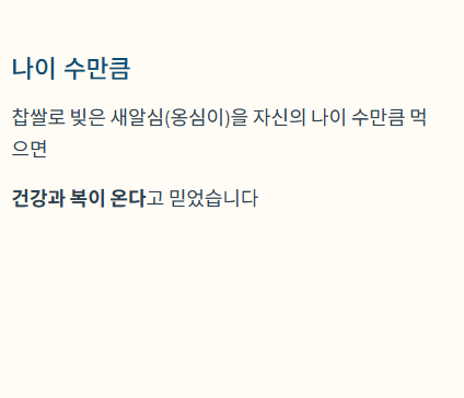 | 새알심 | 찹쌀로 빚은 새알심(옹심이)을 자신의 나이 수만큼 먹으면 건강과 복이 온다고 믿었습니다. |