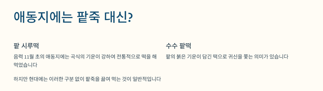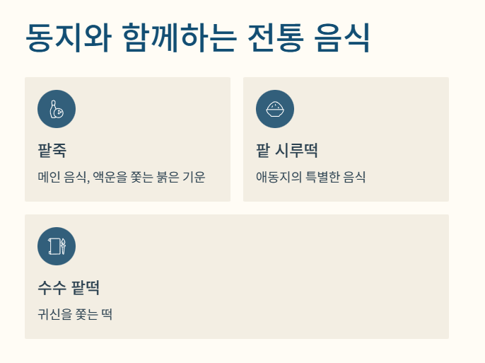 | 2025년 동짓날 | 2025년 12월 22일 (월요일) | 평일이라 미리 준비해두면 좋습니다! |