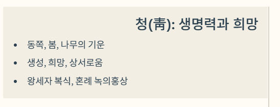 - 활용: 궁궐의 동쪽을 푸른색으로 칠하거나, 왕세자의 옷, 혼례 때 신부의 녹의홍상에서 녹색(청색 계열) 치마로 사용되어 새로운 시작과 성장을 기원했습니다.