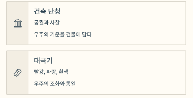 - 단청: 궁궐이나 사찰에 칠하는 화려한 색채는 건물을 보호하는 기능과 동시에 오방색을 사용하여 우주의 기운을 건물에 불어넣는 상징적인 역할을 합니다.