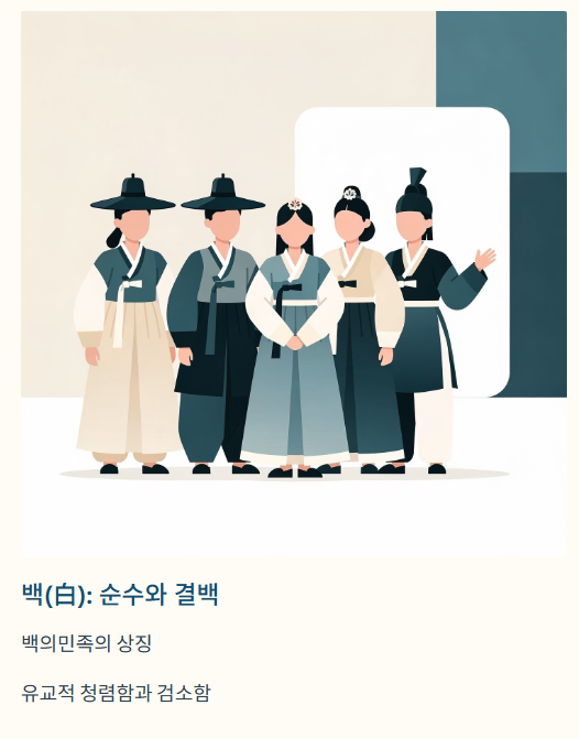 - 활용: 조선 시대 **백의민족(白衣民族)**이라 불릴 정도로 평상복으로 흰색을 즐겨 입었습니다. 이는 유교적인 청렴함과 검소함을 드러내는 색으로도 여겨졌습니다.