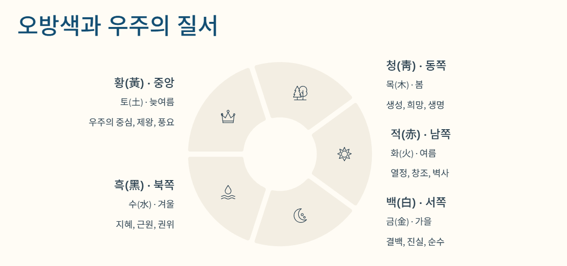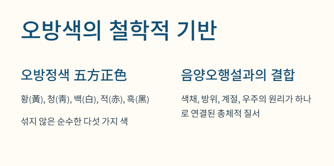 이 색채 체계는 단순한 미적 기준이 아닌, 동양 철학의 핵심인 음양오행설에 그 뿌리를 두고 있습니다.