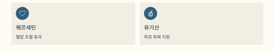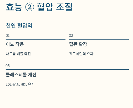 | 퀘르세틴 (Quercetin) | 플라보노이드의 일종. 혈압 조절 및 항염 작용. | 고혈압 완화, 알레르기 반응 억제. |