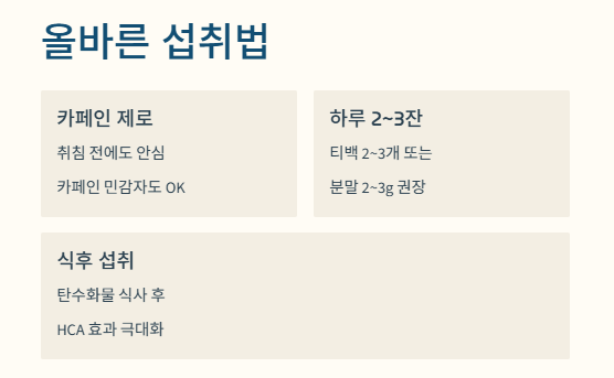 | 섭취 시간 | 식후 (특히 탄수화물 섭취 후) | 식후에 마시면 HCA가 지방 합성 억제에 더 효과적입니다. |