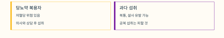| 당뇨약 복용자 | 혈당을 낮추는 효과가 있어 당뇨약을 복용하는 경우, 혈당 수치가 너무 낮아지는 저혈당 위험이 있으므로 복용 전 의사와 상담이 필수입니다. |