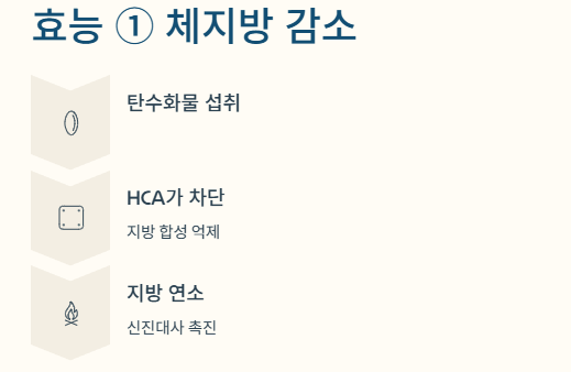 | HCA (하이드록시구연산) | 구연산의 일종. 탄수화물이 지방으로 합성되는 것을 억제. | 체지방 감소 및 다이어트에 핵심적인 역할. |