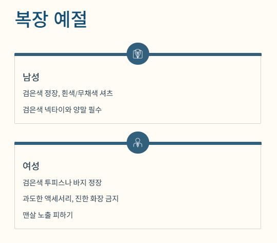 | 복장 (남성) | 검은색 정장(없다면 어두운색), 흰색/무채색 셔츠, 검은색 넥타이, 양말은 반드시 검은색. |