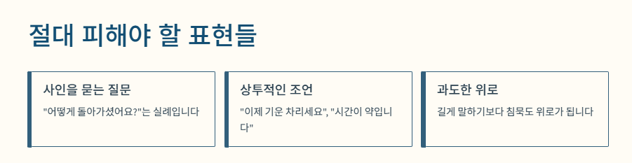 | 친분이 깊은 상주 | "뭐라 위로의 말씀을 드려야 할지 모르겠습니다. 얼마나 상심이 크시겠습니까." | 공감과 슬픔을 표현하되, 말을 아낍니다. |