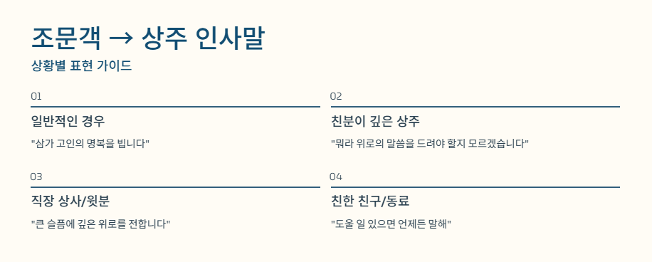 | 상황 | 인사말 예시 (조문객 → 상주) | 팁 |