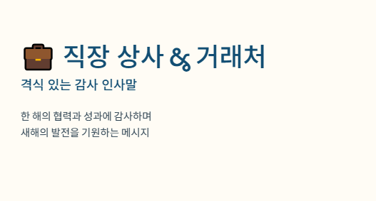 직장 상사나 거래처에는 한 해의 '협력과 성과'에 대한 감사와 '새해의 발전'을 기원하는 격식 있는 문구를 사용합니다.