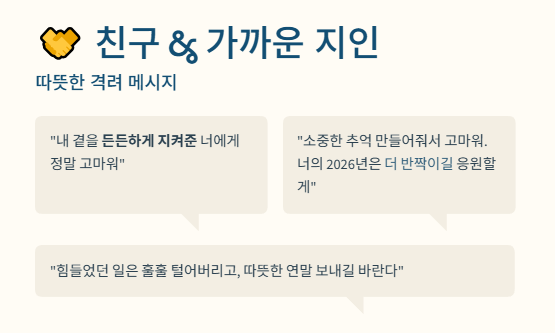- "바쁜 일상 속에서도 소중한 추억 만들어줘서 고마워. 너의 2026년은 더 반짝이길 진심으로 응원할게."