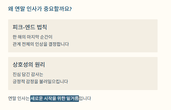 연말 인사는 '피크-엔드 법칙(Peak-End Rule)'의 심리학적 원리를 활용하여 관계를 강화하는 기회입니다.
