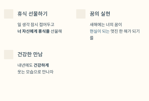 - "지금까지 잘 해내신 것처럼, 내년에도 긍정적인 에너지로 멋진 날들 만들어가시기를 응원합니다."