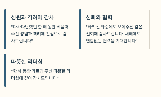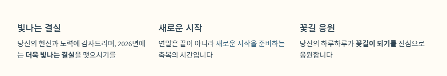 - "당신의 헌신과 노력에 감사드리며, 2026년에는 더욱 빛나는 결실을 맺으시기를 진심으로 기원합니다."