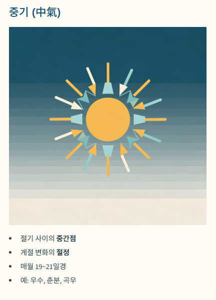 | 중기 (中氣, 12개) | 각 절기와 절기 사이의 '중간' 지점. (우수, 춘분, 곡우, 소만 등) |