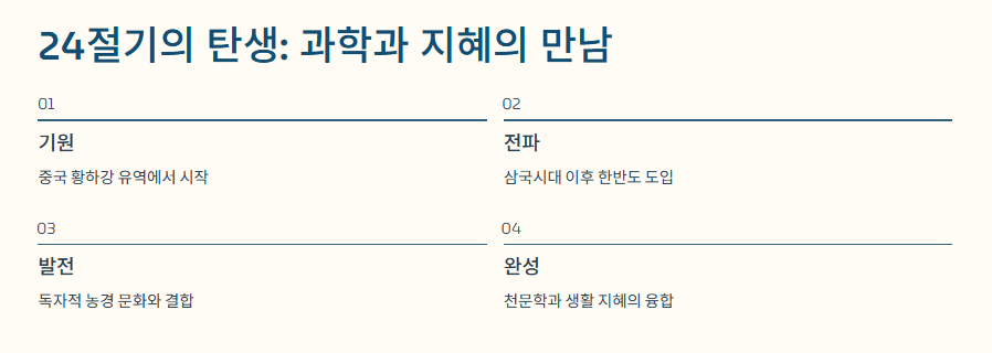 24절기는 중국 황하강 유역에서 시작된 것으로 알려져 있으며, 기원전부터 농경민들에게 필수적인 생활 지표였습니다.
