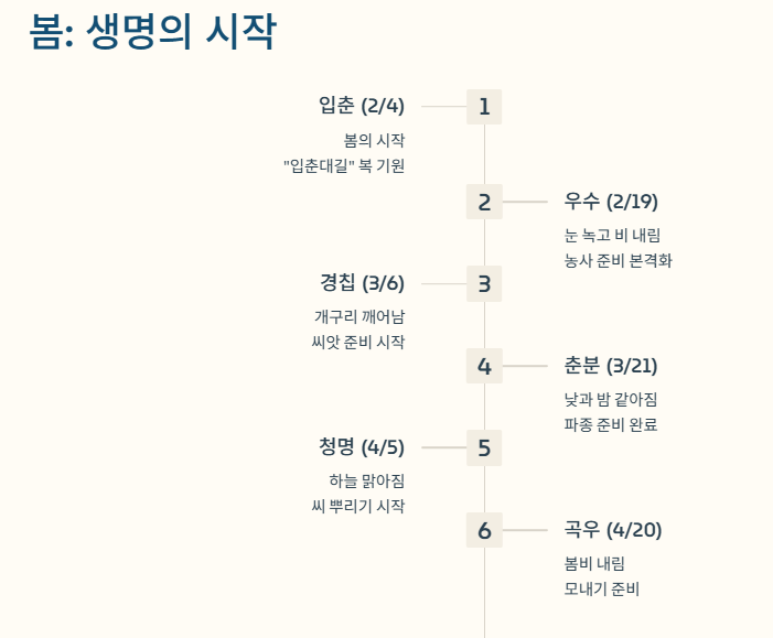 | 춘분 (春分) | 3/21경 | 밤과 낮의 길이가 같아지는 시기. 씨앗을 뿌릴 준비를 하는 중요한 절기. |