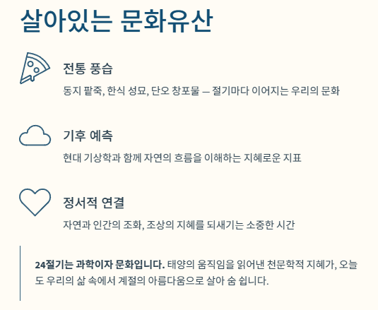현대는 농경 사회가 아니지만, 24절기는 여전히 우리의 생활 방식과 문화 속에 깊숙이 남아있습니다.