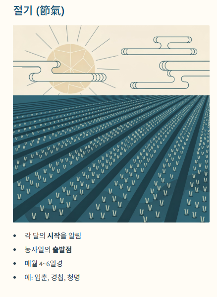 | 절기 (節氣, 12개) | 각 달의 '시작'을 알리는 절기. (입춘, 경칩, 청명, 입하 등) |