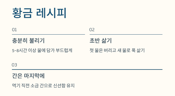 - 충분히 불리기: 녹두는 딱딱하므로 최소 5~8시간 이상 충분히 불려야 부드러운 식감을 얻을 수 있습니다.