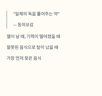 예로부터 우리 조상들은 몸에 열이 나거나 기력이 떨어졌을 때, 혹은 잘못된 음식을 먹고 탈이 났을 때 가장 먼저 녹두죽을 찾았습니다. 허준의 《동의보감》에서는 녹두를 일컬어 "일체의 독을 풀어주는 약"이라 기록할 만큼 그 해독 능력을 높게 평가했는데요.